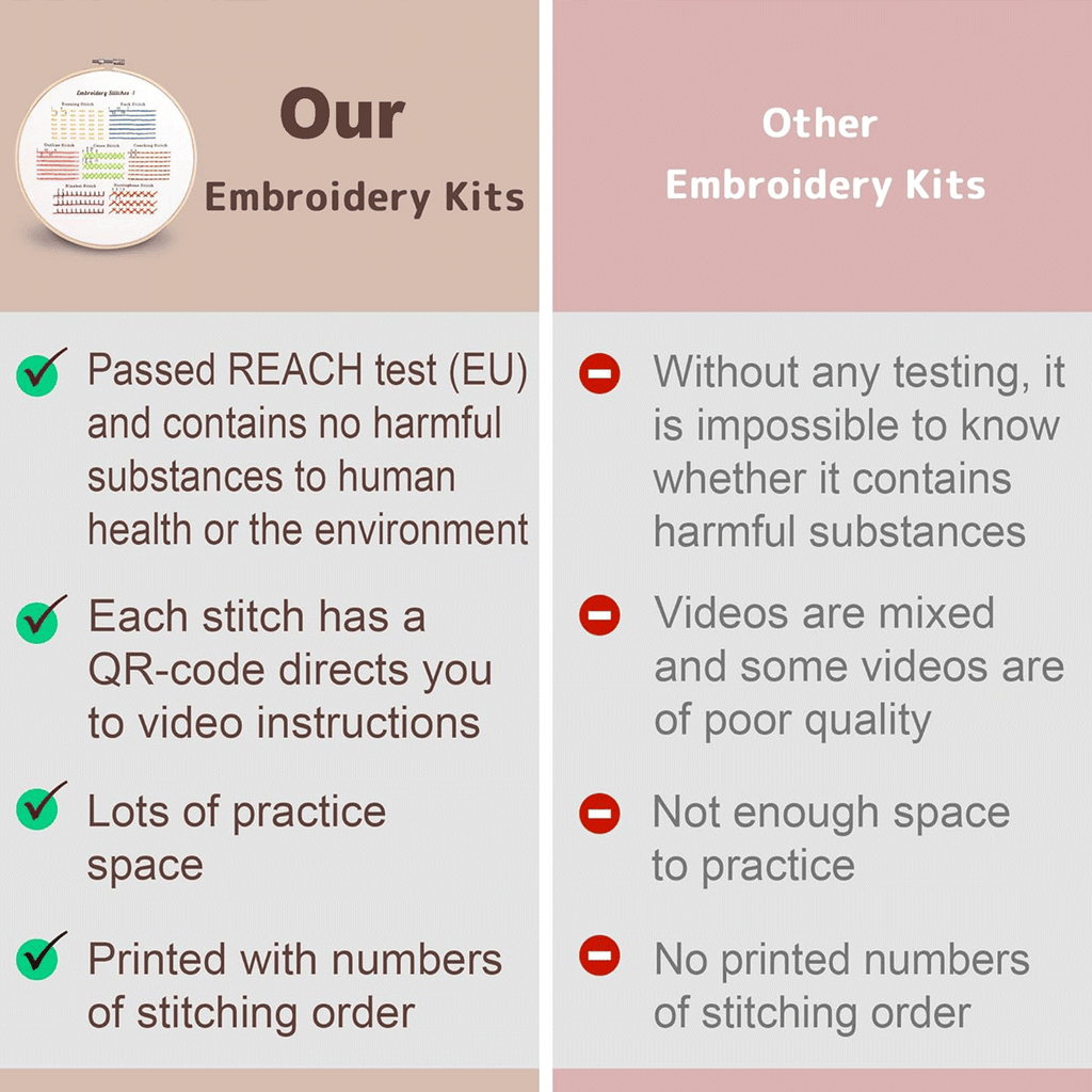 - 【Guaranteed you'll learn how to embroider】Do you know why the embroidery kits on the market fail to solve the problem of "difficult to learn for beginners"? Because most of them "don't have good teaching videos or haven't taught from scratch." Our exclusively designed embroidery kits include easy-to-follow video tutorials that teach you from the basics: how to separate floss, how to tie knots, how to end stitches, and more. And teach you in detail how to complete each pattern. It can effectively solve the problem of "difficult to learn for beginners". You'll learn how to embroider, if not, we have a money-back guarantee in 30days.