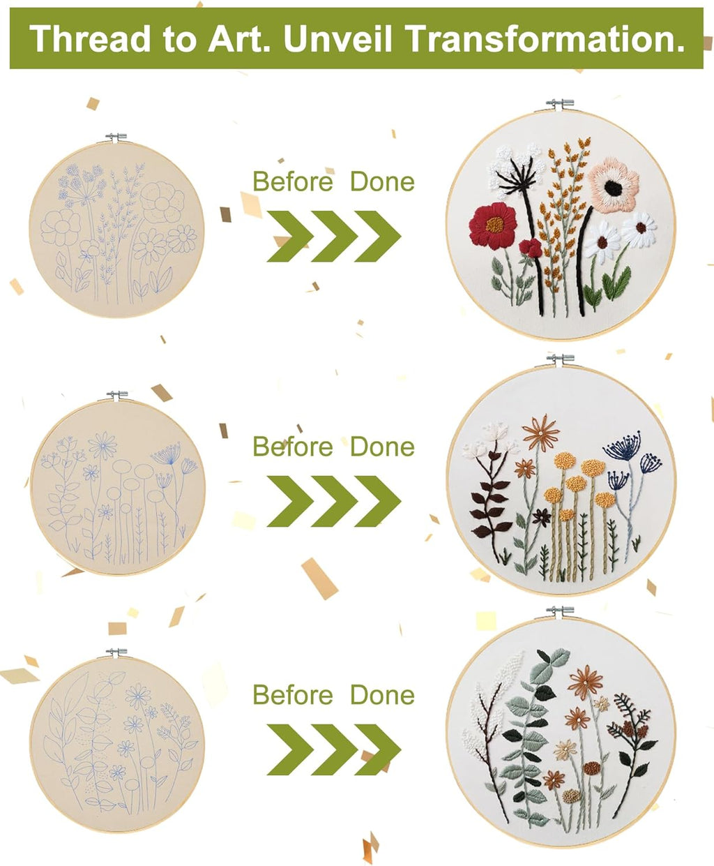 - CUTE EMBROIDERY PATTERNS: This kit includes 3 floral patterns printed on cloth, perfect for beginners. Follow the steps to complete each design, then wash away the water-soluble patterns for a clean, professional finish.