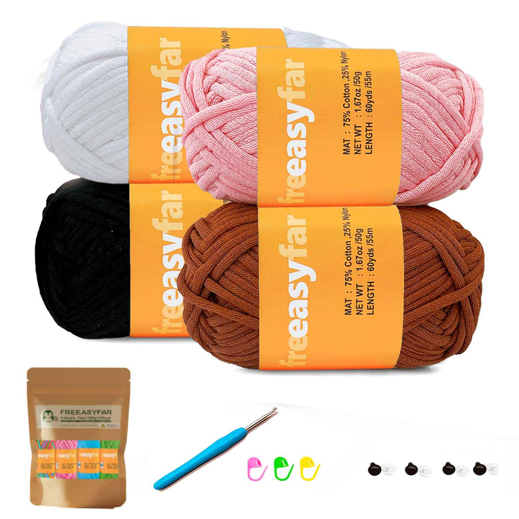 • 🧶 PREMIUM MATERIALS: Cotton-nylon blend provides a smooth, modern finish; Yarn won't split, fray, or snag; 75% cotton, 25% nylon; 4pack (1.67 oz / 50 g, 60yds / 55 m); Machine wash cold and dry. And the bag contains crochet hook,stitch marker, and safety eyes too. that is perfect for all your crafting projects.