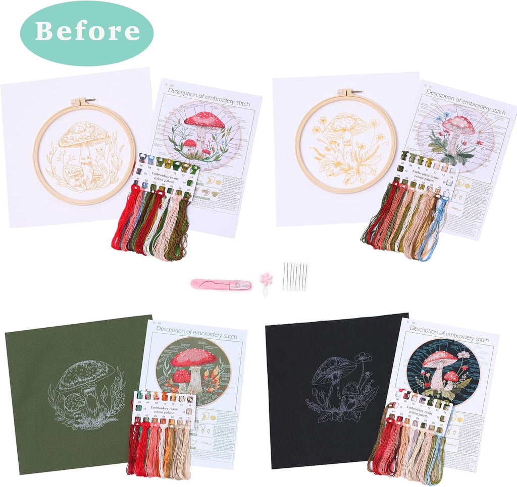 - [Beginner Kit] 4 pcs complete embroidery kits including: 4 pcs 11.8 inches x 11.8 inches (30 cm) cotton fabric with patterns, 2 pcs 7.8 inches (20 cm) embroidery rings, 1 scissors, 4 manual, 8 pins and enough colored thread.