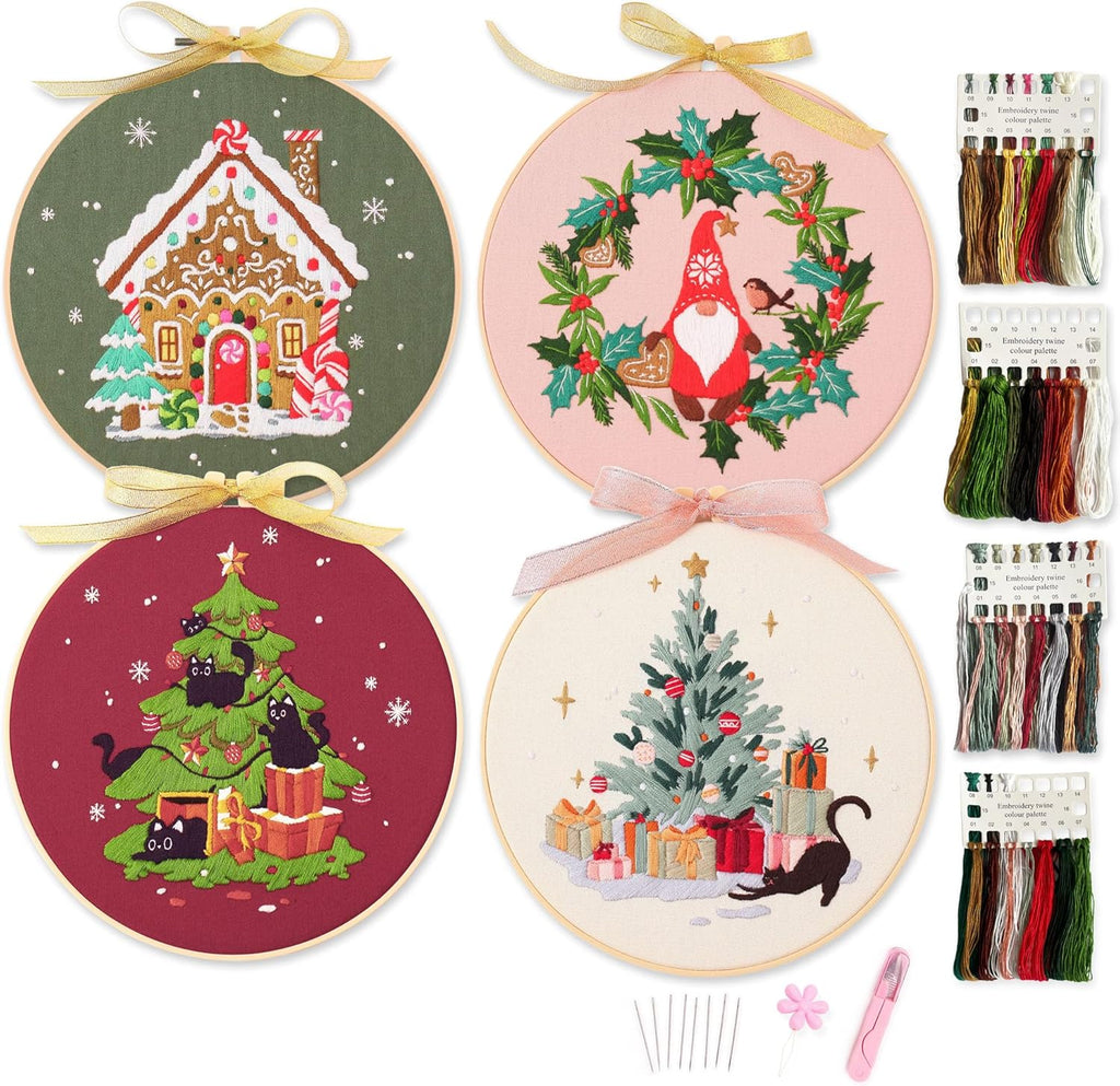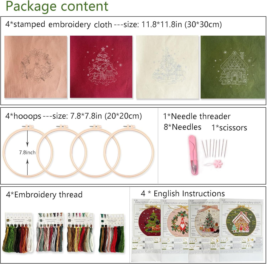 -Festive Embroidery Kit: This kit includes 4 sets of lovely Christmas-themed embroidery patterns, perfect for adults to create beautiful holiday decor.