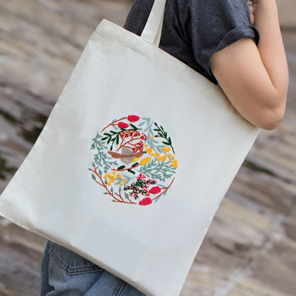 -Easy & Funny: Perfect for all ages. Valuable sewing craft kits, this stamped embroidery kit includes a cotton bag (34x40cm/13.4x15.7inch) with beautiful pre-printed pattern, 8-inch bamboo-like embroidery hoop, threads, needles and easy-to-follow English instructions