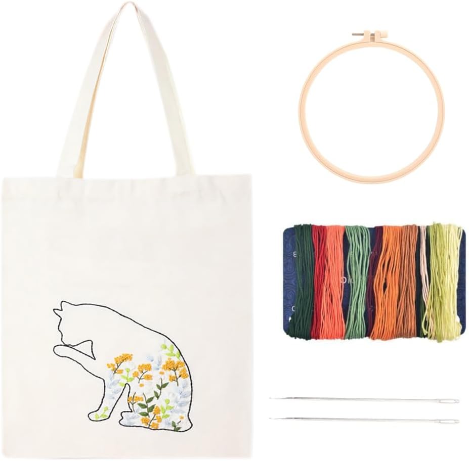 -Easy & Funny: Perfect for all ages. Valuable sewing craft kits, this stamped embroidery kit includes a cotton bag (34x40cm/13.4x15.7inch) with beautiful pre-printed pattern, 8-inch bamboo-like embroidery hoop, threads, needles and easy-to-follow English instructions