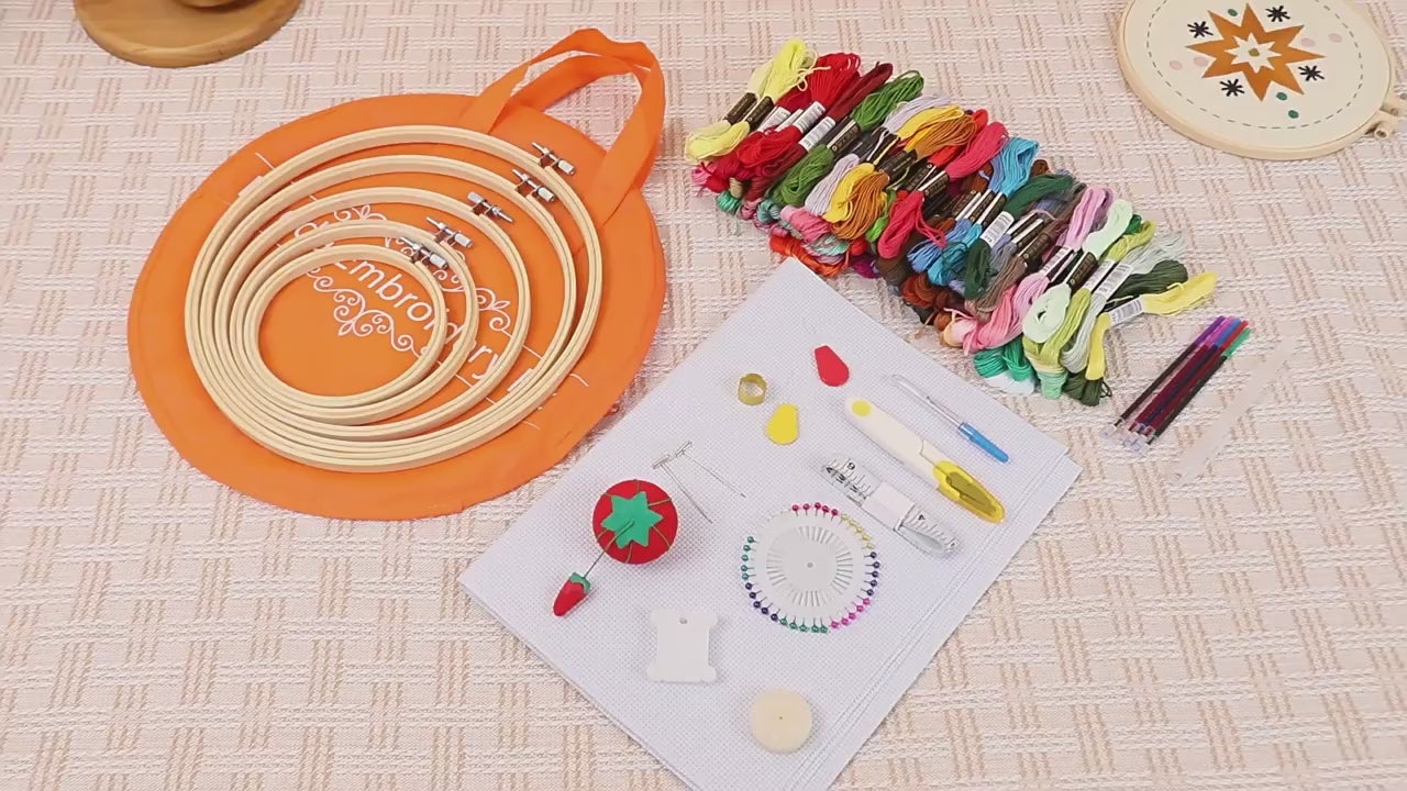 - Package Content:5 pcs embroidery hoops,100 pcs color embroidery threads,3 pcs Aida cloths,40 pcs sewing pins,30 pcs embroidery needles,20 pcs floss bobbins,5 pcs water-soluble pen